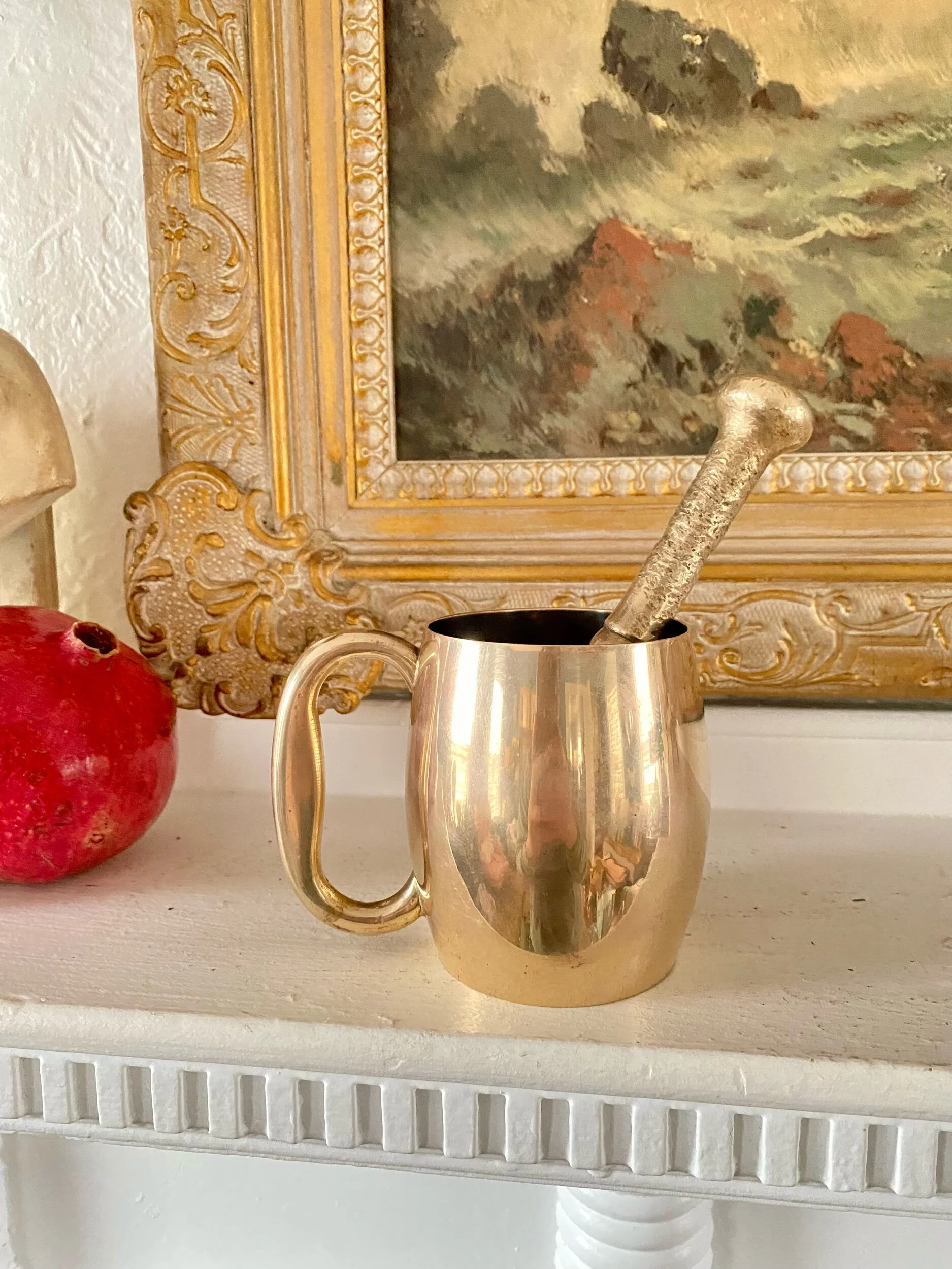 …freshly polished, solid brass and beautiful, freshly polished with some vintage wear, this handsome pairing of a brass moscow mule mug and pestle make a great gift! note the mug does have a faint monogram “ N J R”.