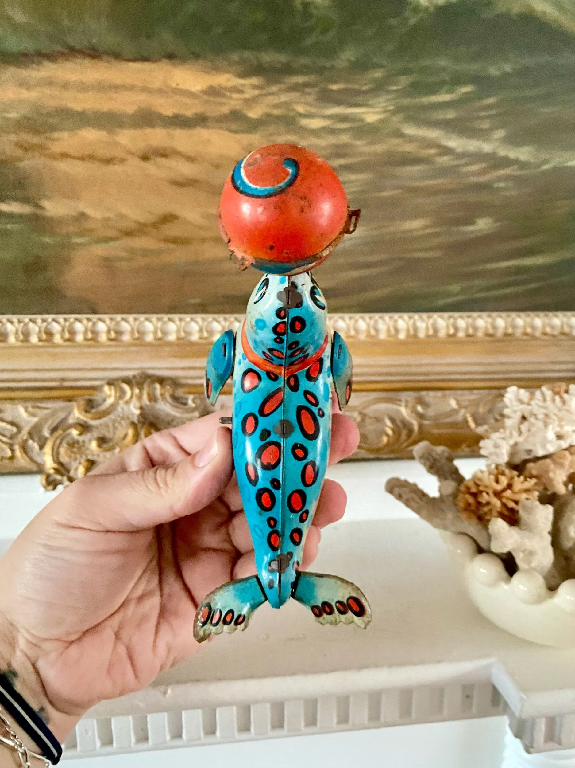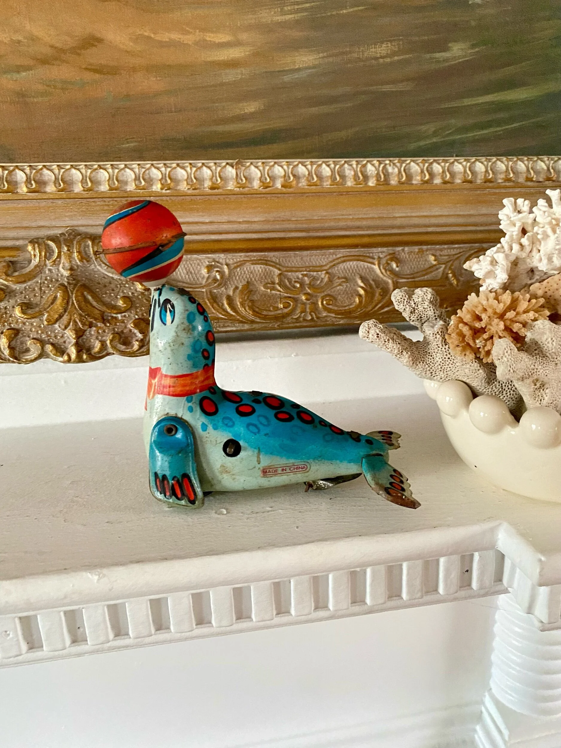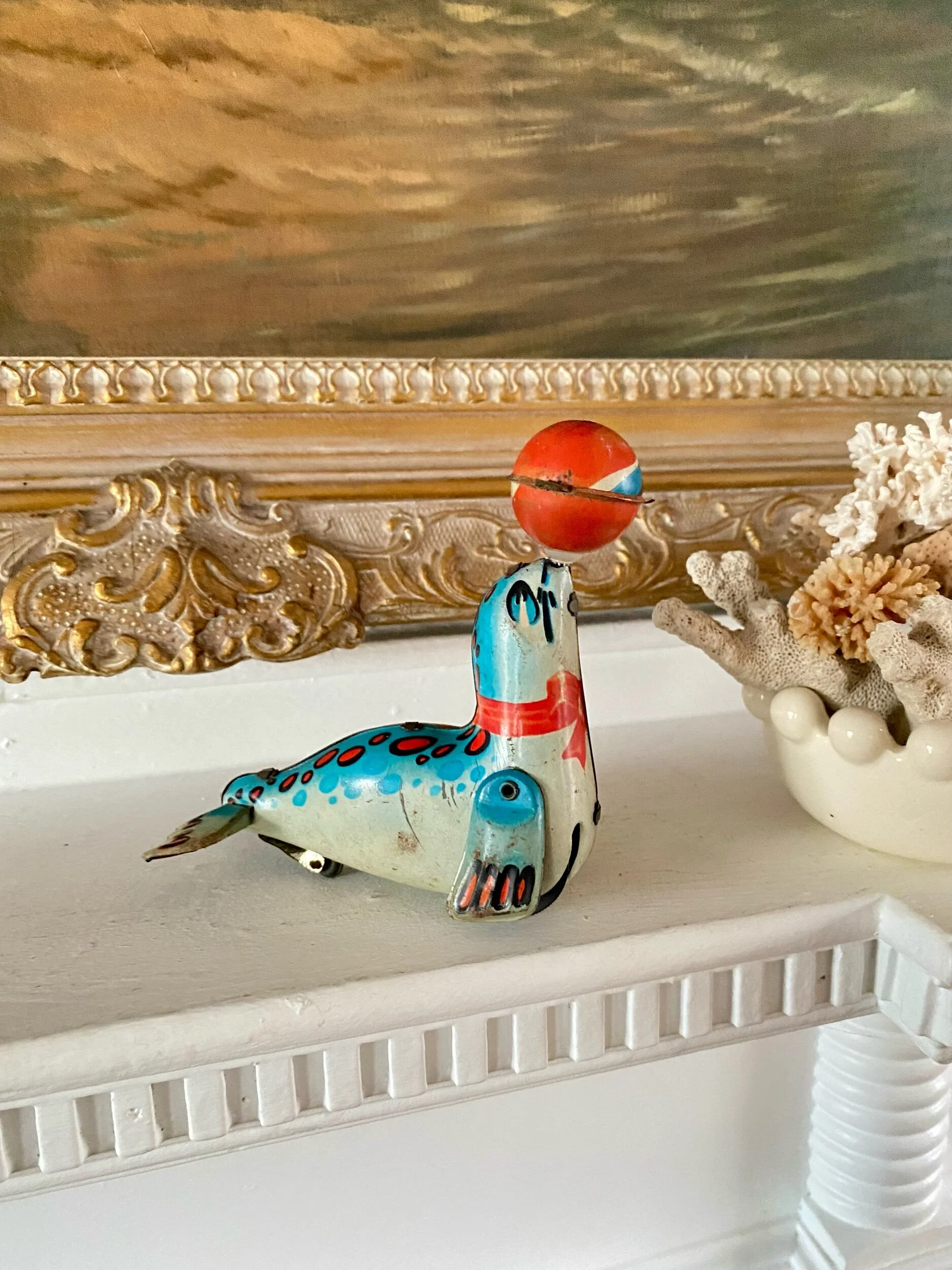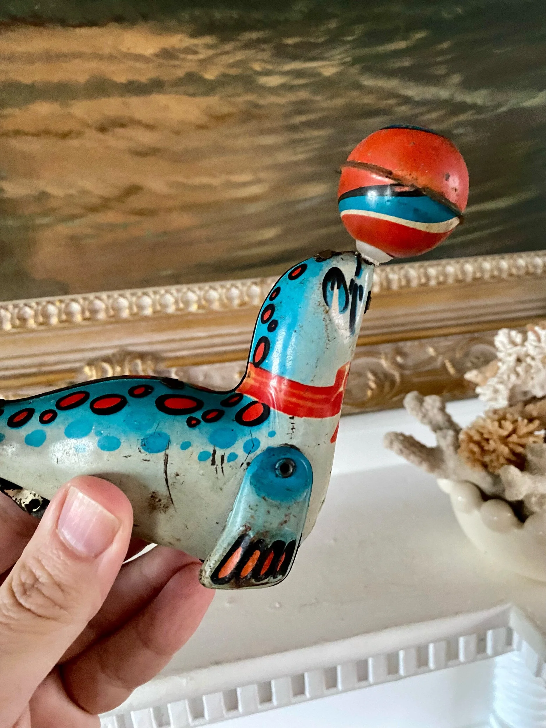… cute vintage seal balancing a ball on it’s nose toy, really wonderful colors and character in this piece, all though no longer functioning and winding, its still such a cool kitschy fun vintage toy of it’s time. stands as a great little fun decorative element! vintage wear as shown.