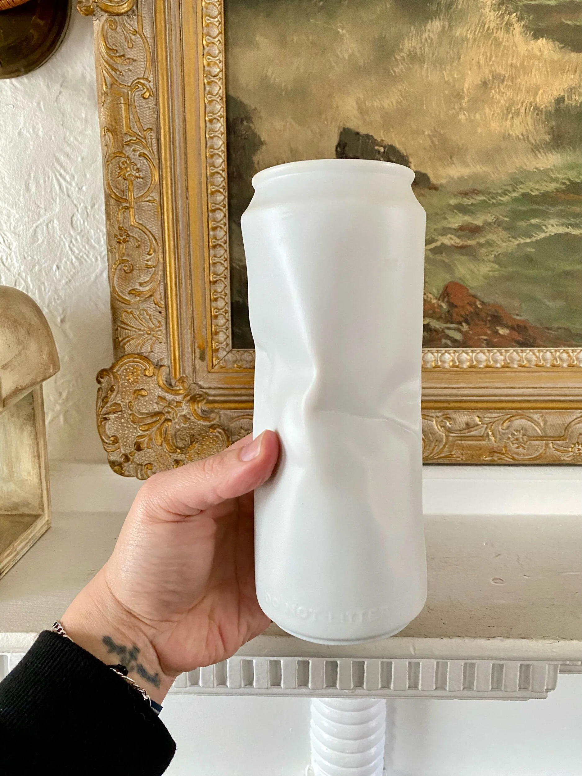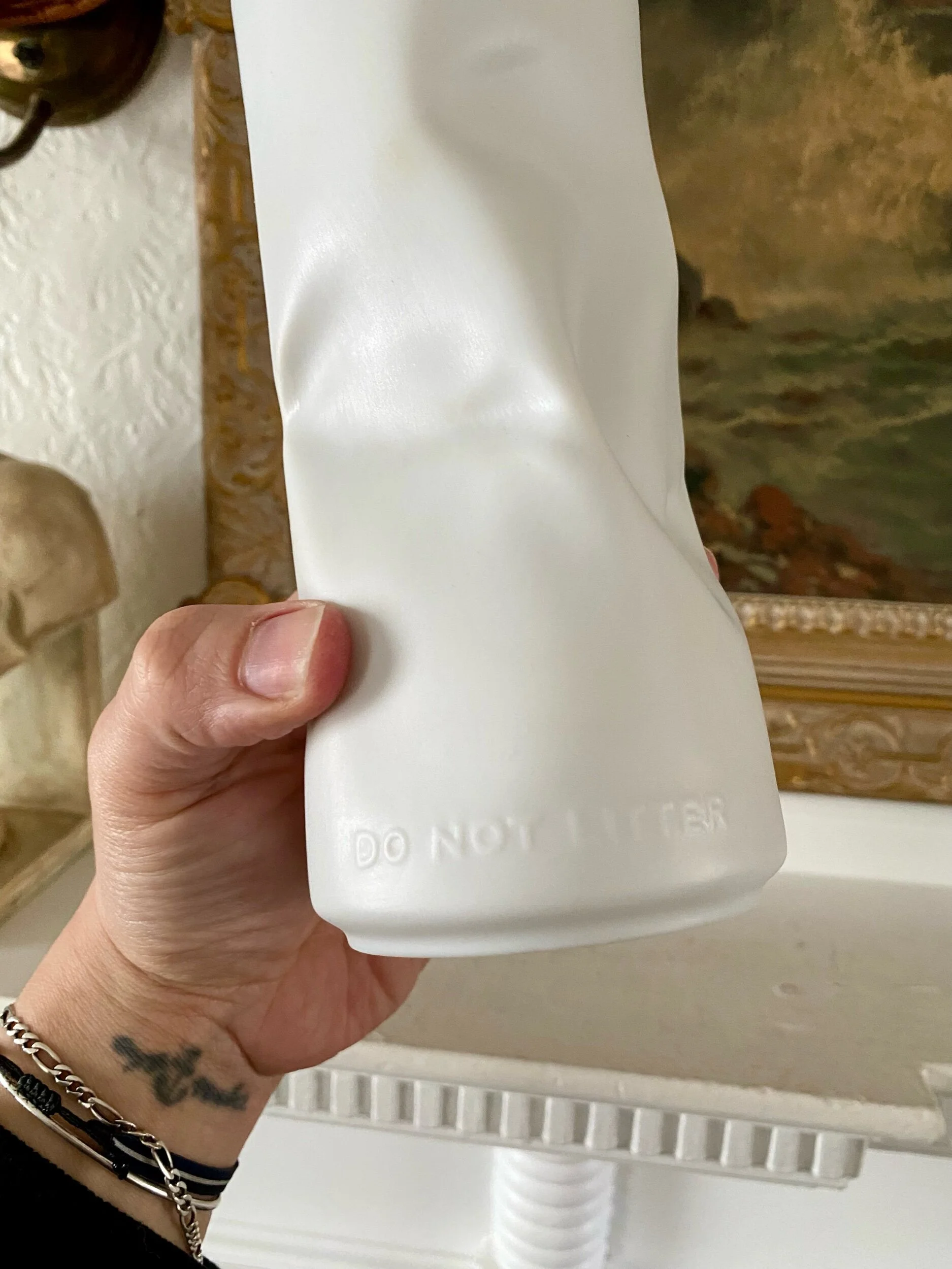 pristine, this iconic rosenthal hallmarked porcelain bisque crushed and crinkled can sculpture and or vase / art object is signed on the bottom. tapio wirkkala designed it for the rosenthal studio mine, made in germany. this is called the do not litter can, the cans are a rare silhouette within this line. circa 1990.