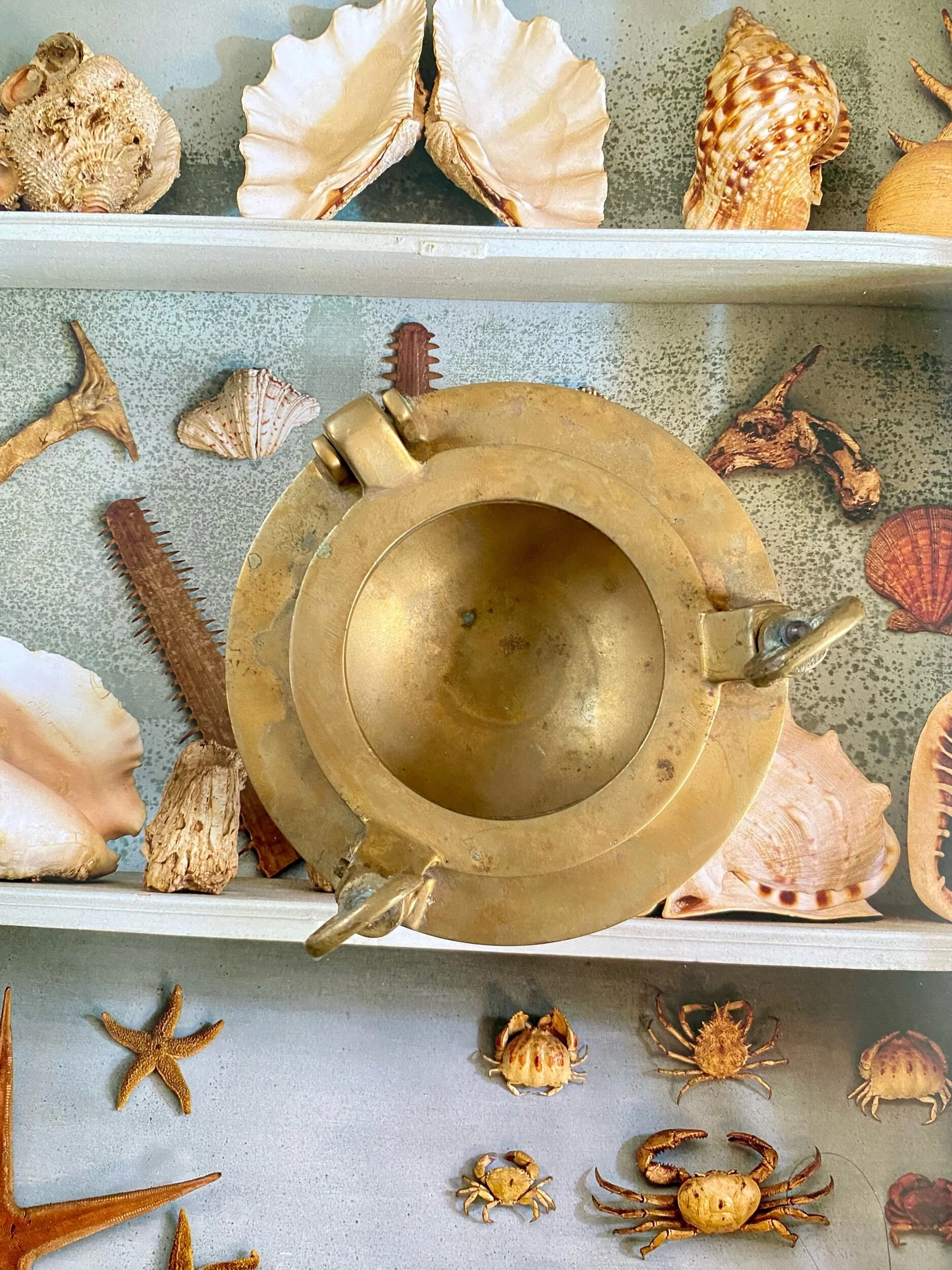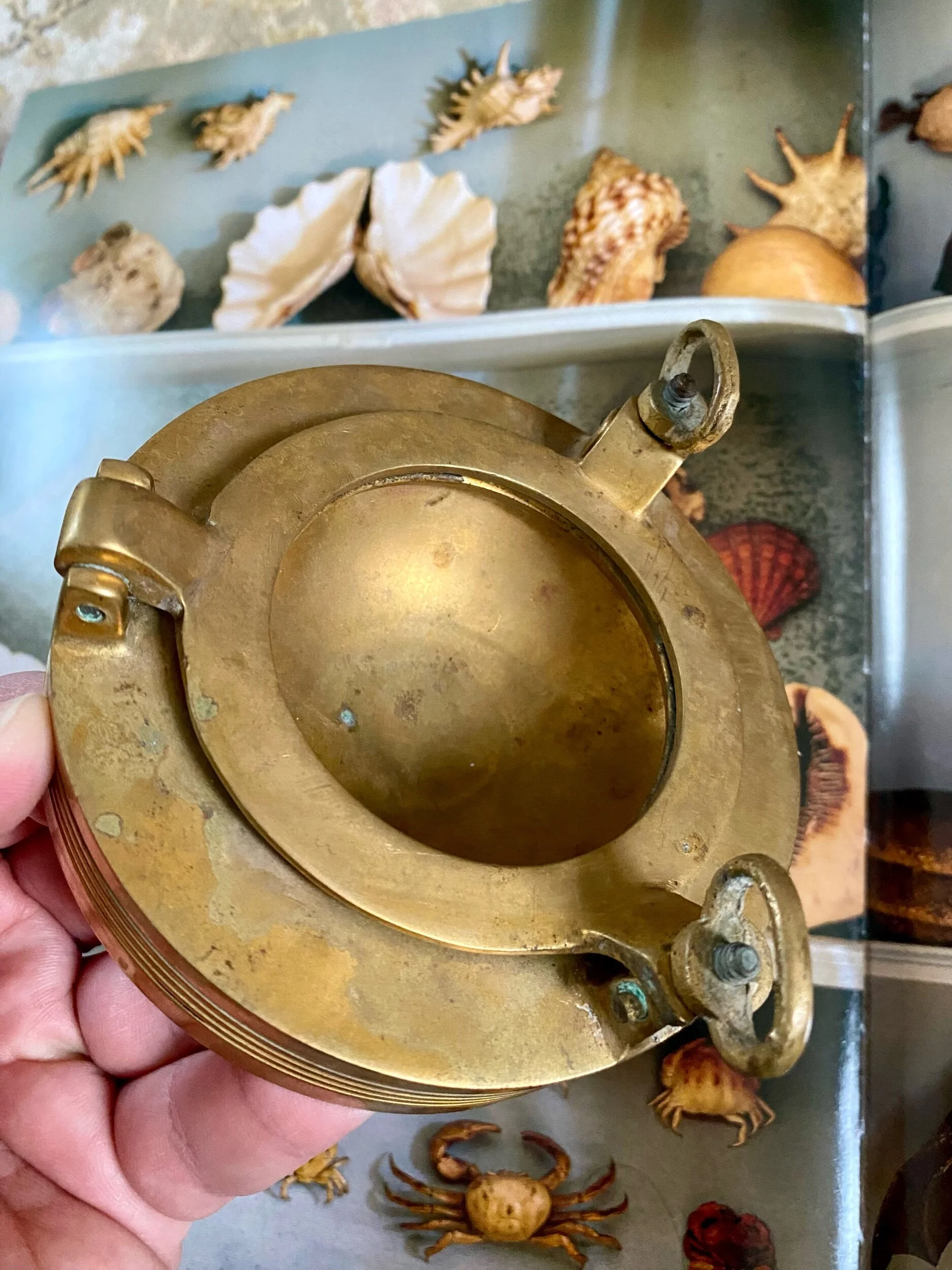 …stunning solid brass piece, heavy with gorgeous patina to it, the two little notched handles unscrew to lock and release the porthole frame as shown. great to use this to hold little treasures like coral fragments, or as a ring dish!