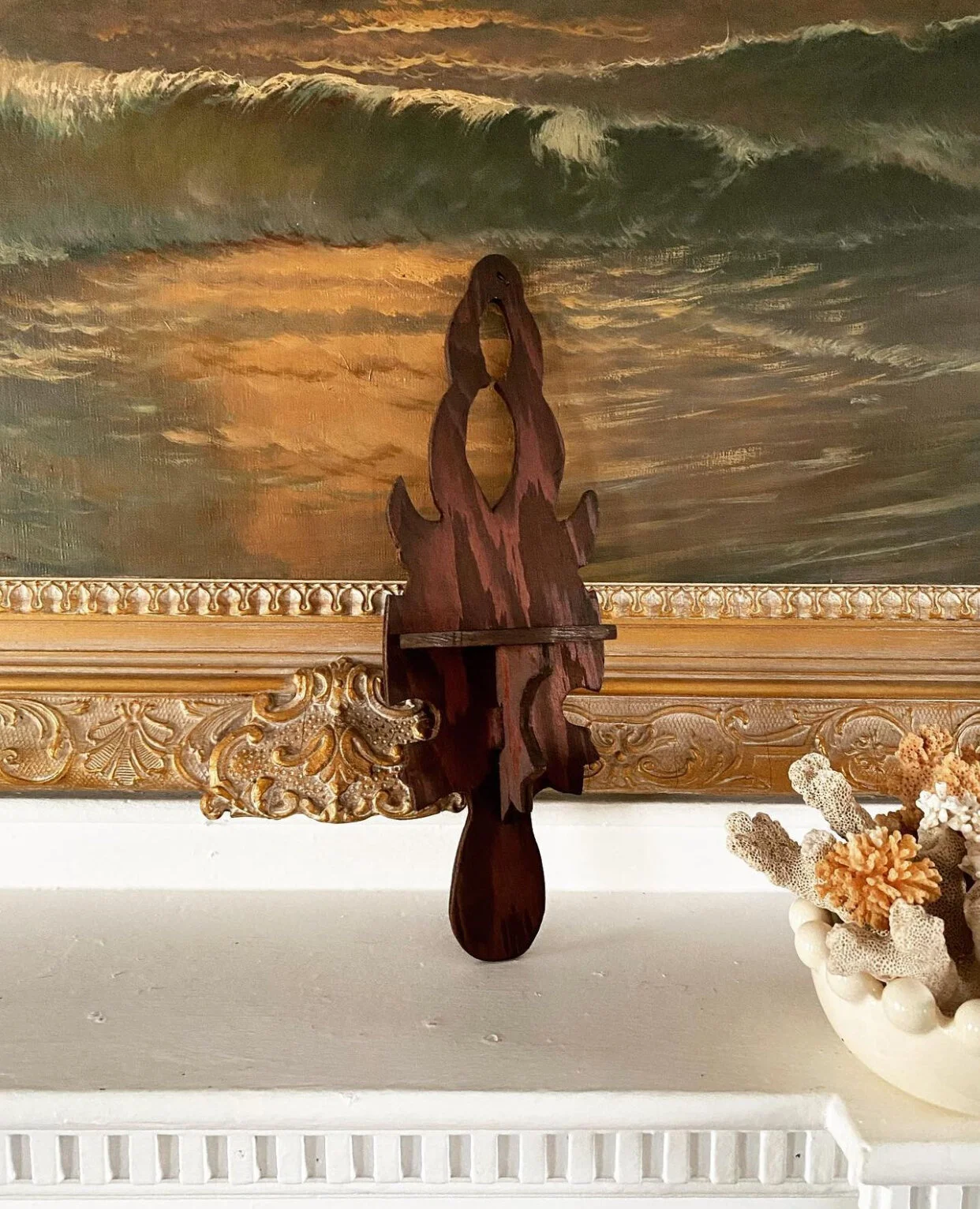 furniture + display vintage brass footed stand plinth $55.00 mid century apothecary watchmaker cabinet $300.00 victorian carved wood bracket shelf, antique $75.00 handmade burlwood platform, vintage $145.00 whimsical vintage carved wood corner shelves, pair $175.00 rare antique oak spool table $145.00 antique black forest walnut carved staghorn corner shelf $135.00 rare antique tramp art wooden spool bin $385.00 antique eastlake wall pocket / towel holder $115.00 vintage wooden florentine bracket, italy $68.00 vintage wood feather brackets, pair $65.00 primitive painted mini stool, vintage $58.00 antique adirondack wood wall pocket $85.00 heavy glass platform, vintage $45.00 gothic vintage wooden bracket $28.00 ceramic nautical & eagle motif wall pocket $75.00 3d nautical whale bin, vintage $38.00