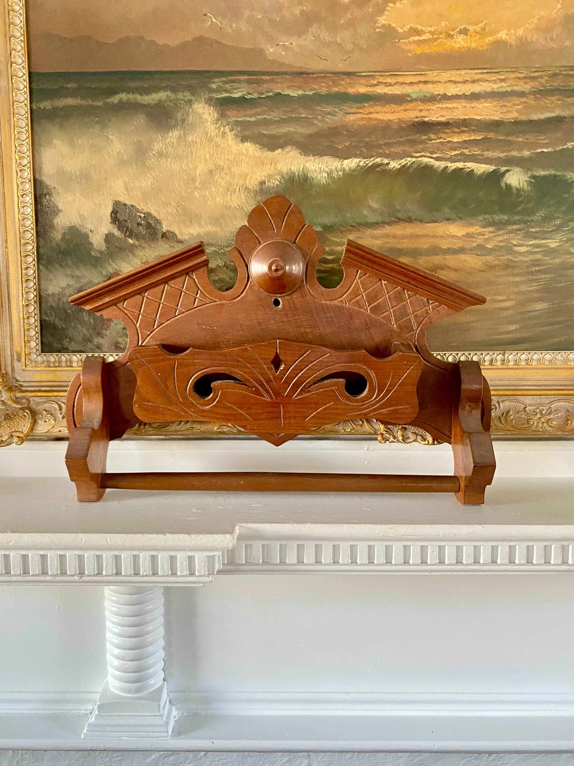 eastlake pieces always have so much character! a beautifully charming eastlake wooden wall plaque with pocket and towel rod, perfect for a kitchen bathroom or even a bedroom - think folded magazine in place of the towel… so many options! wonderful antique condition.