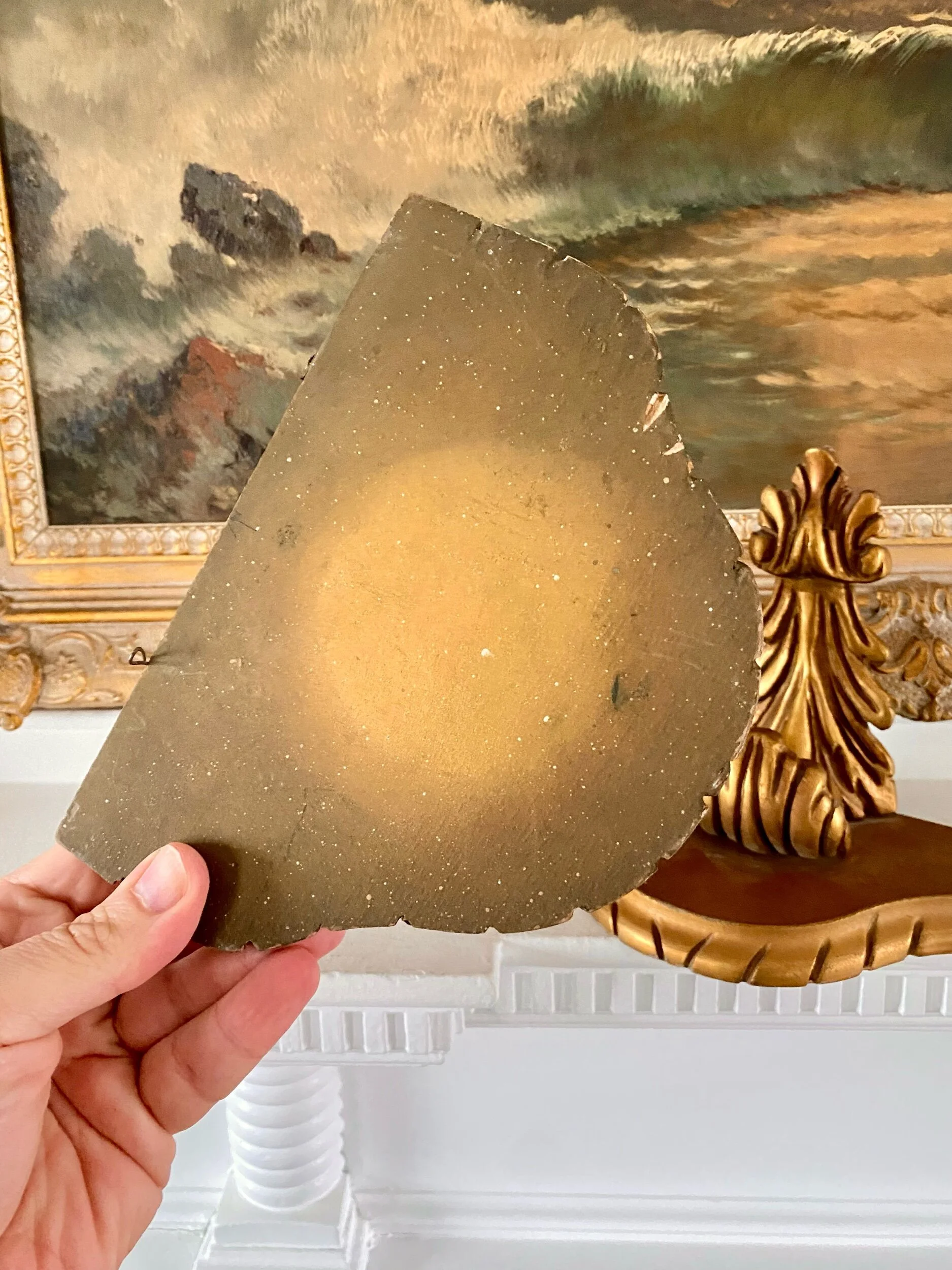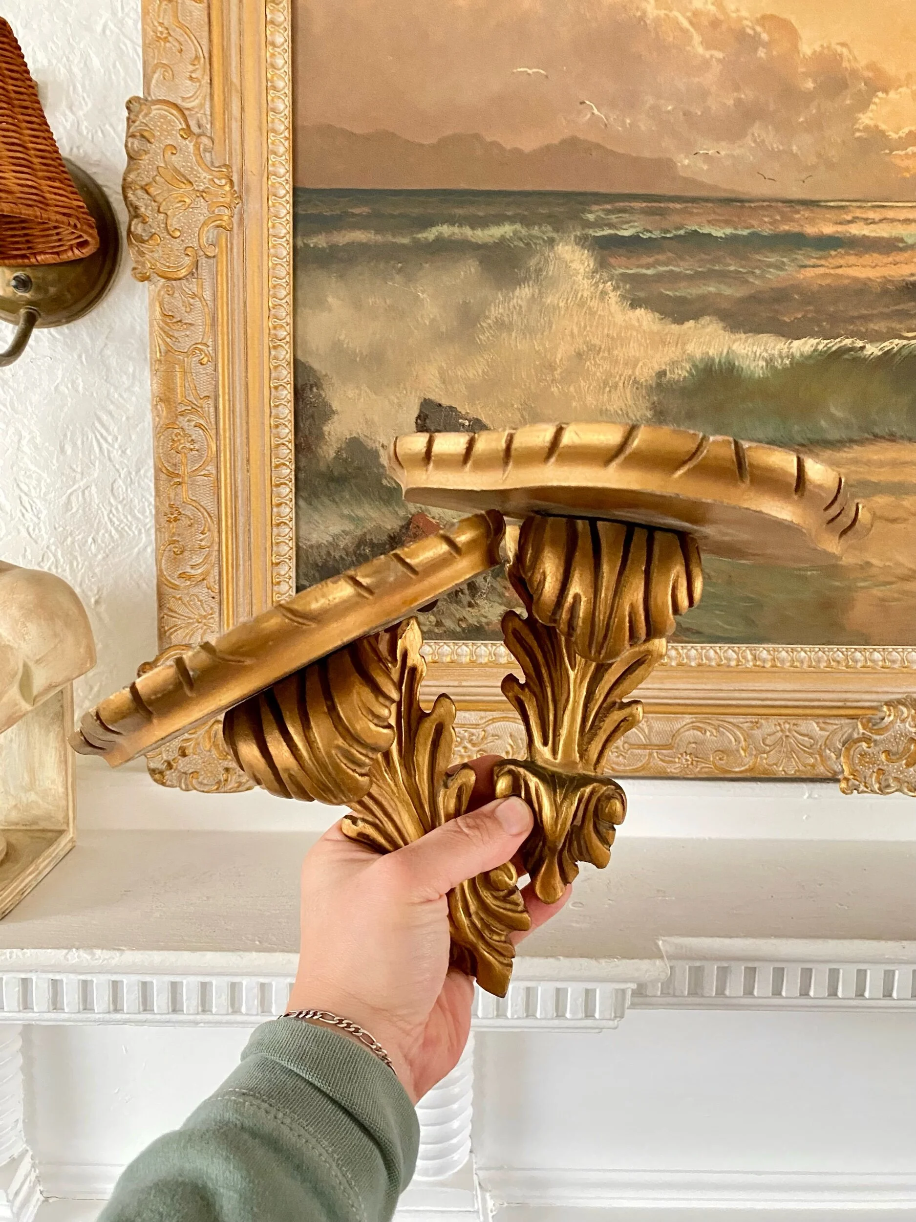 …wonderful gilded gold painted wooden shelf brackets, pair, held by carved feathers filagree. vintage wear as shown, some small chips and discoloration but a wonderfully animated pairing!