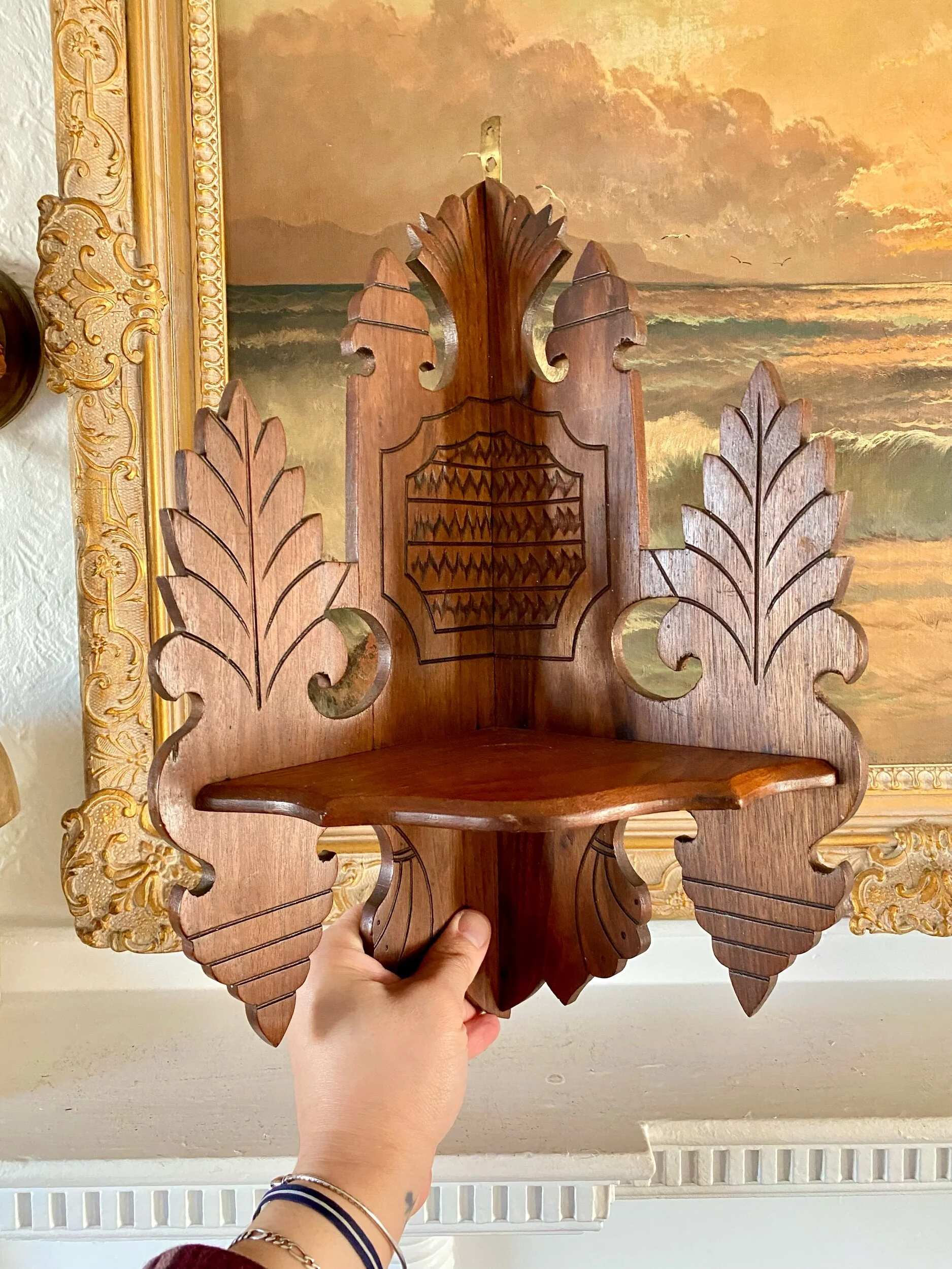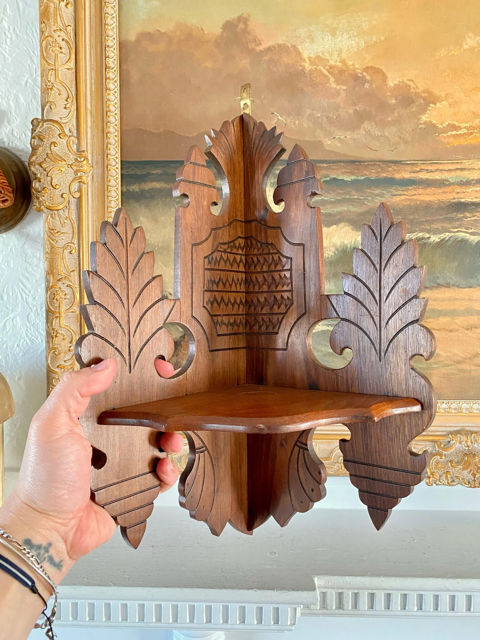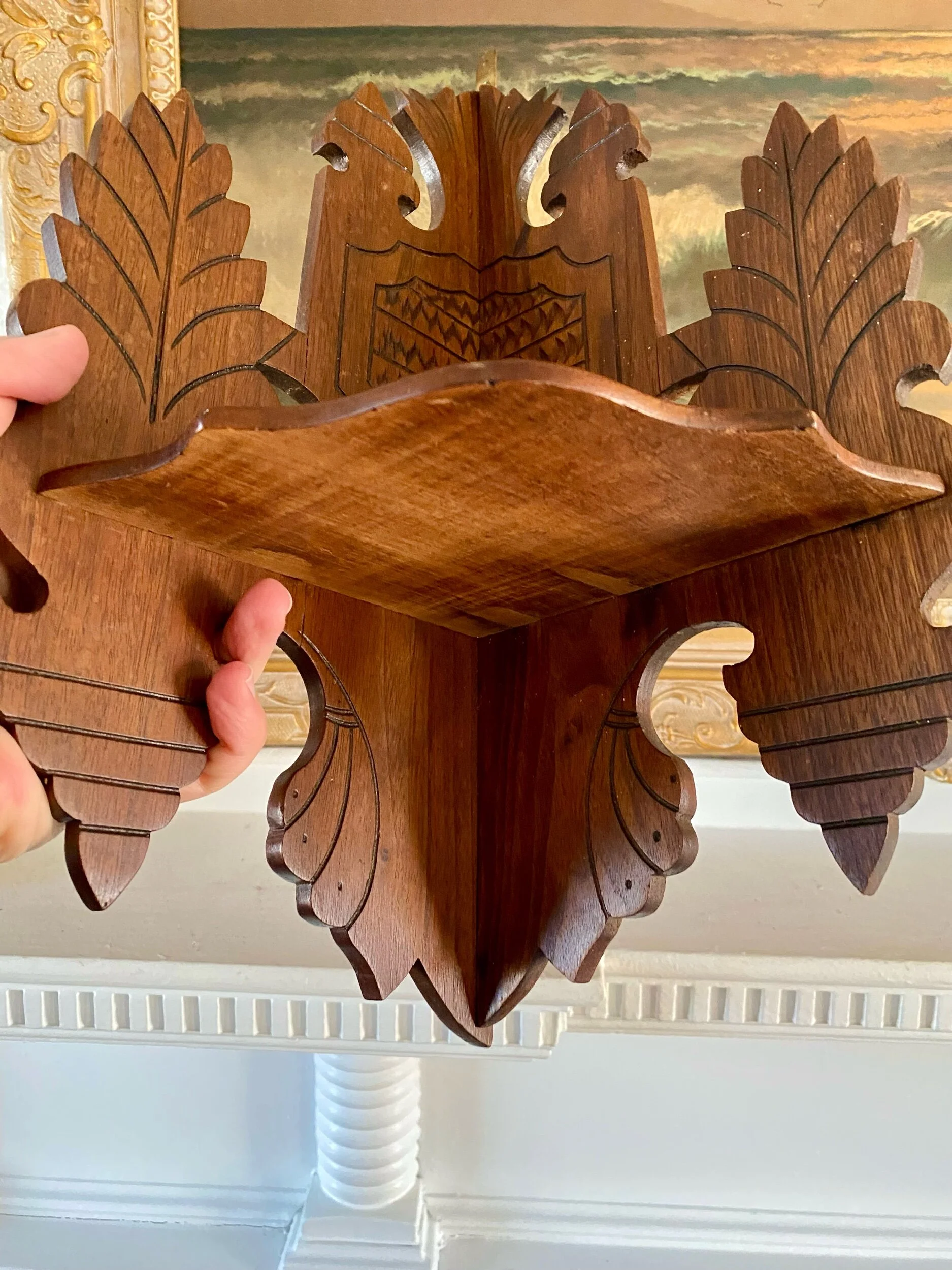 …absolutely love the detail and charm of this duo of corner shelf brackets, they have an eastlake feel to them but their charm and whimsy make them so unique, and to have found the pair, so good! they look to have been repaired before as shown but this is not very evident while looking at the front of each shelf, and they are sturdy and ready to hang / enjoy!