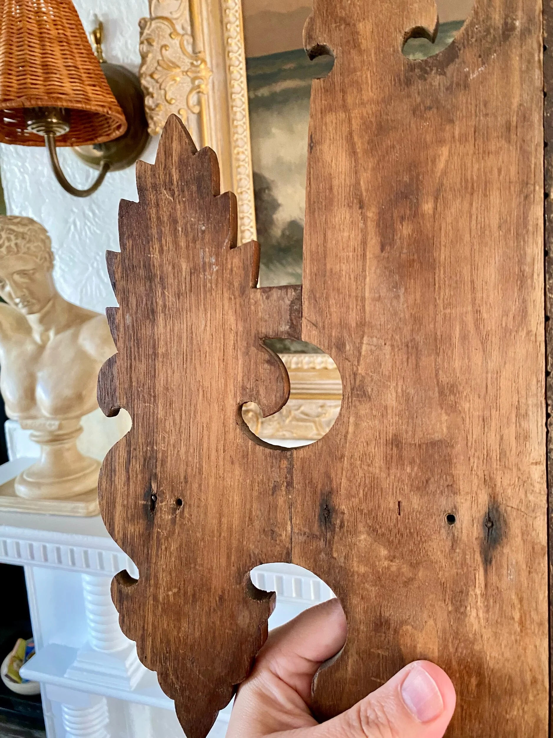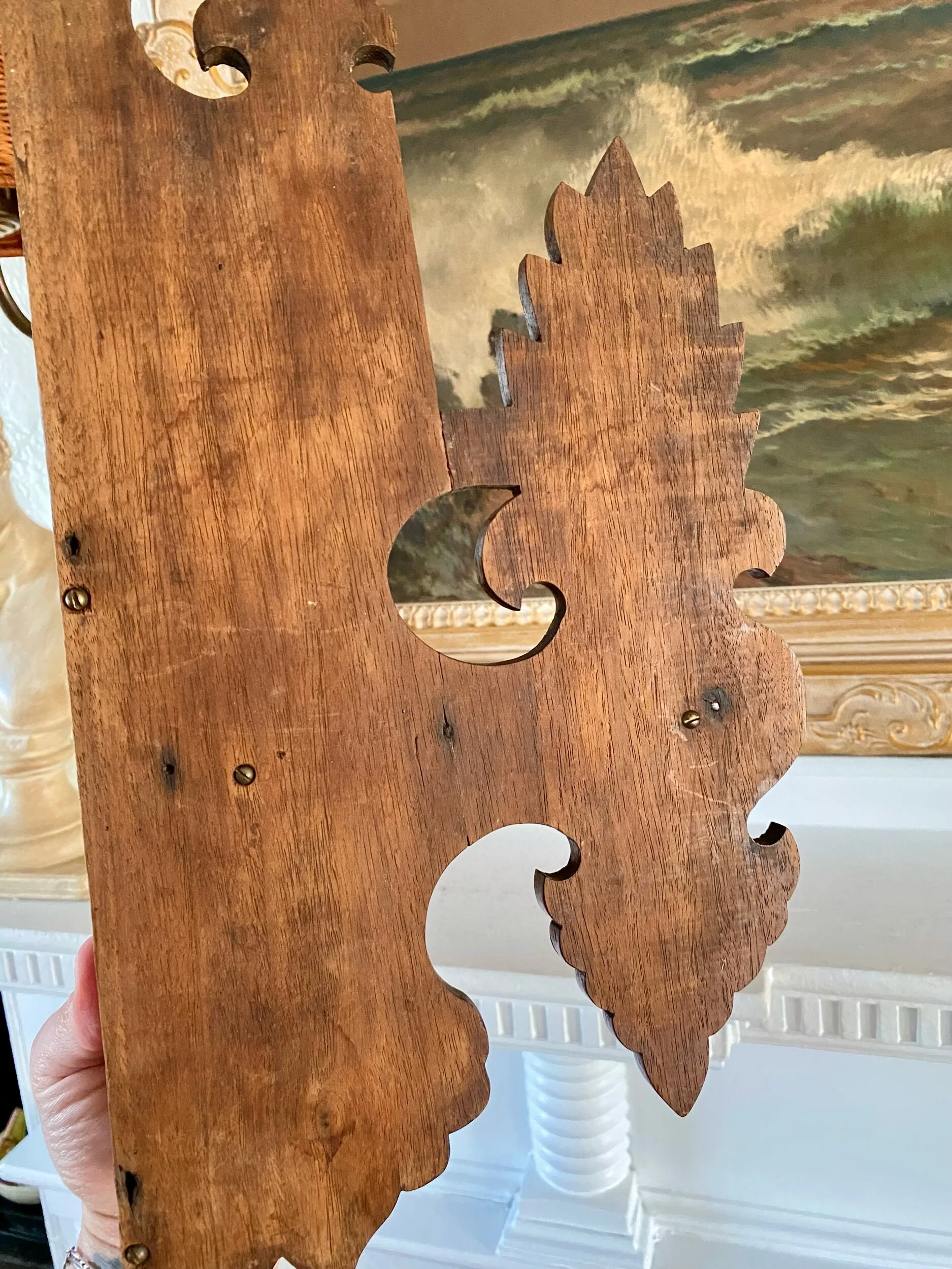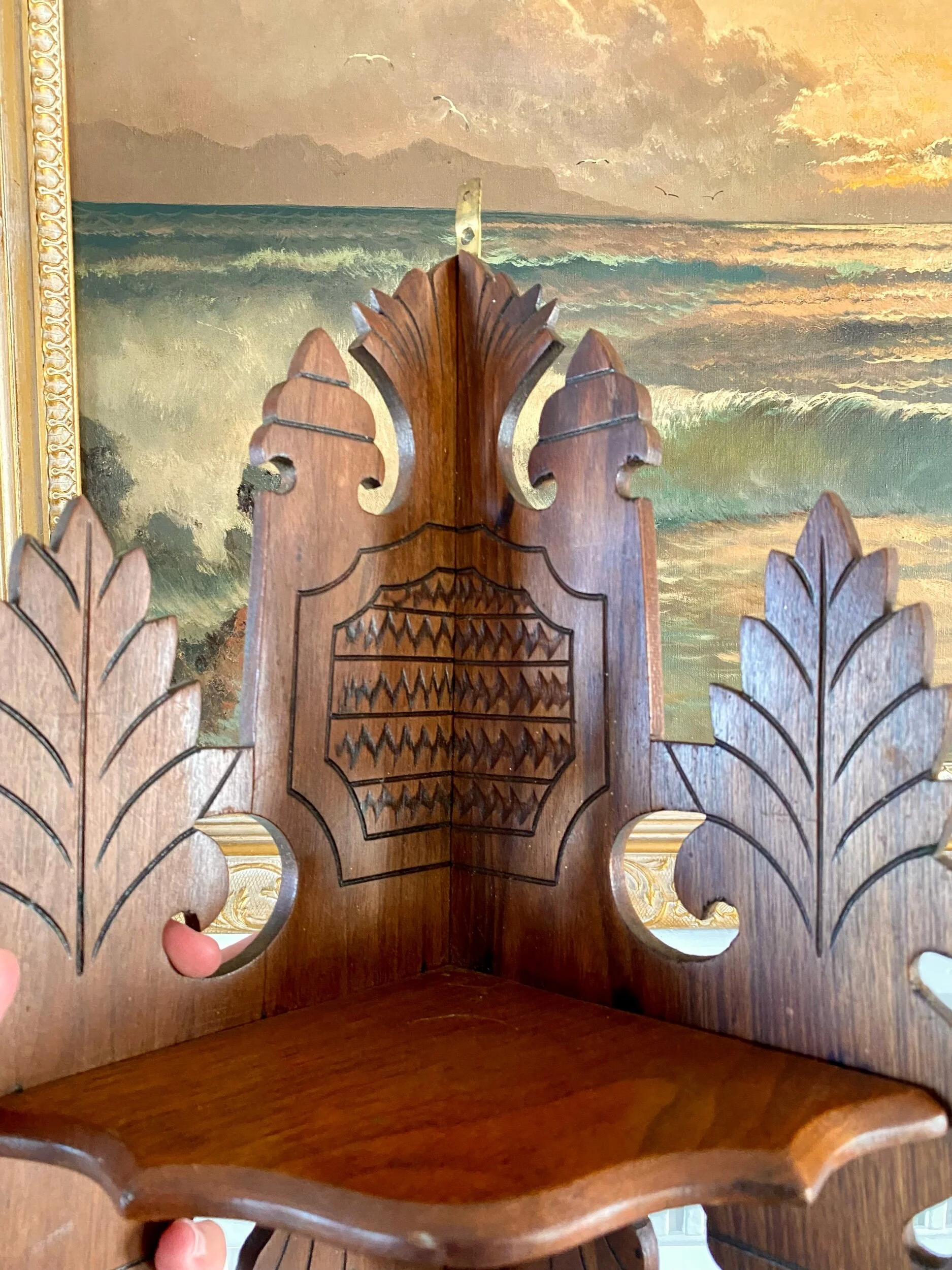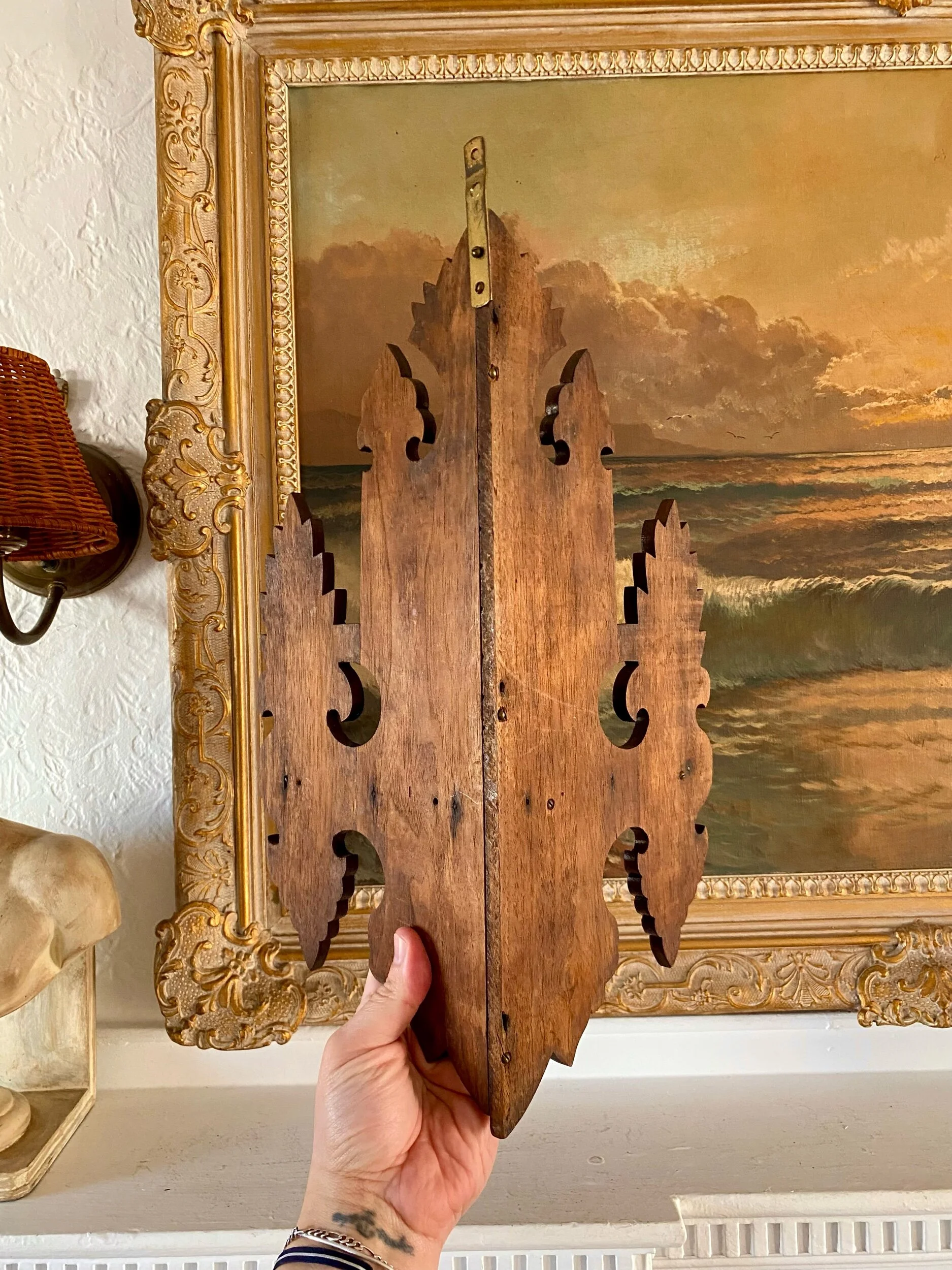 …absolutely love the detail and charm of this duo of corner shelf brackets, they have an eastlake feel to them but their charm and whimsy make them so unique, and to have found the pair, so good! they look to have been repaired before as shown but this is not very evident while looking at the front of each shelf, and they are sturdy and ready to hang / enjoy!