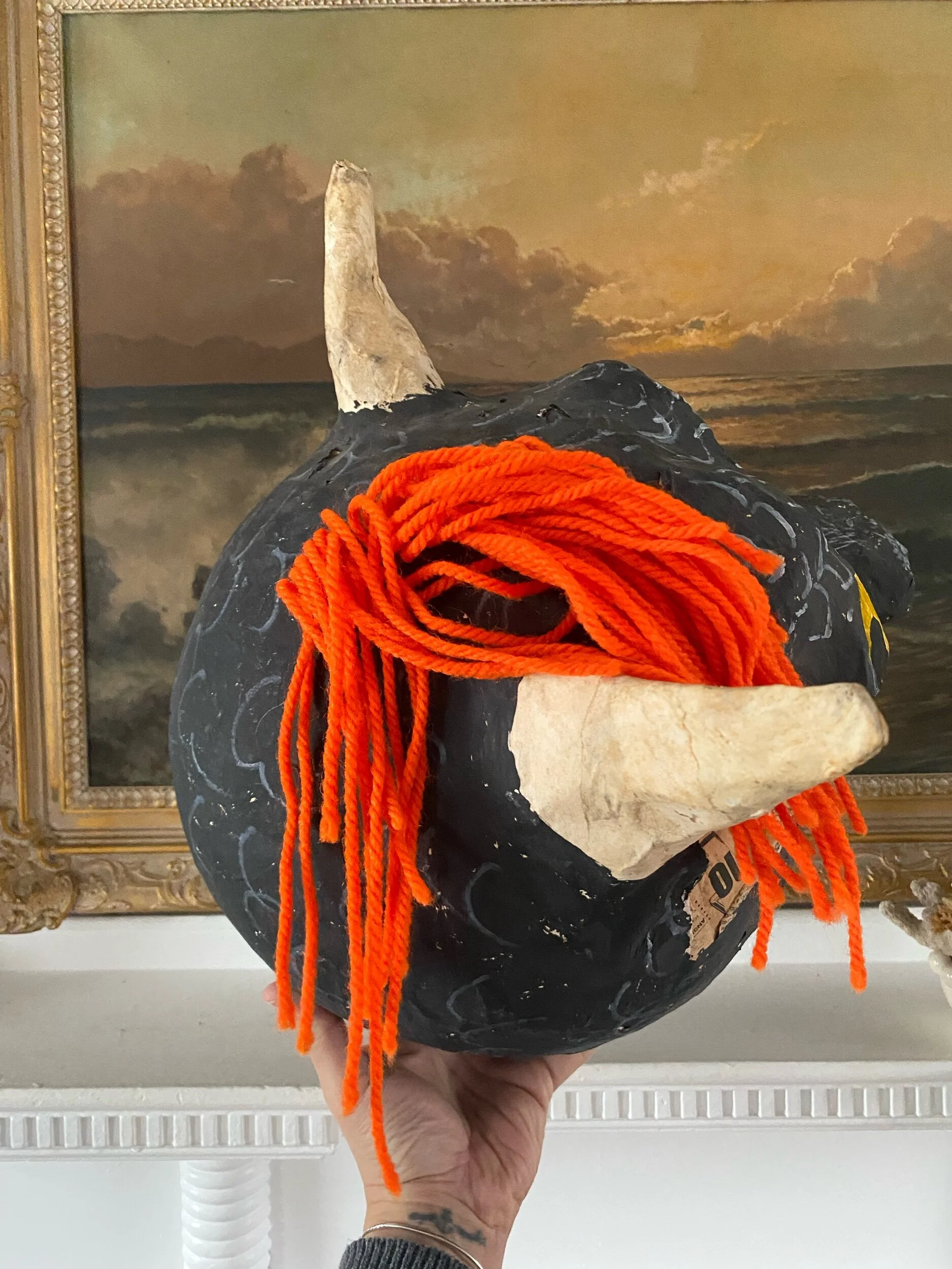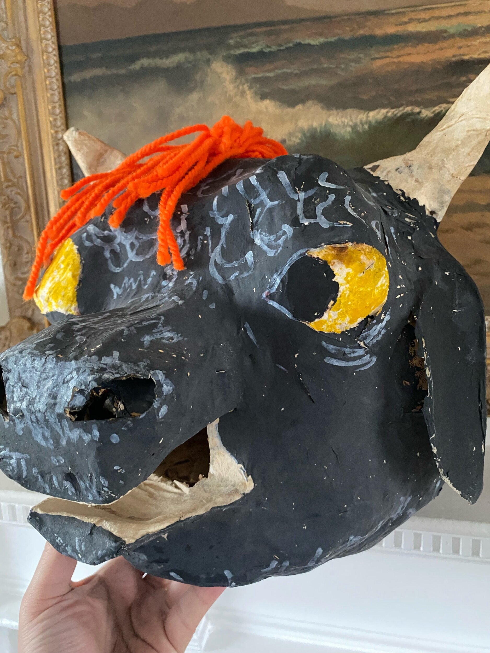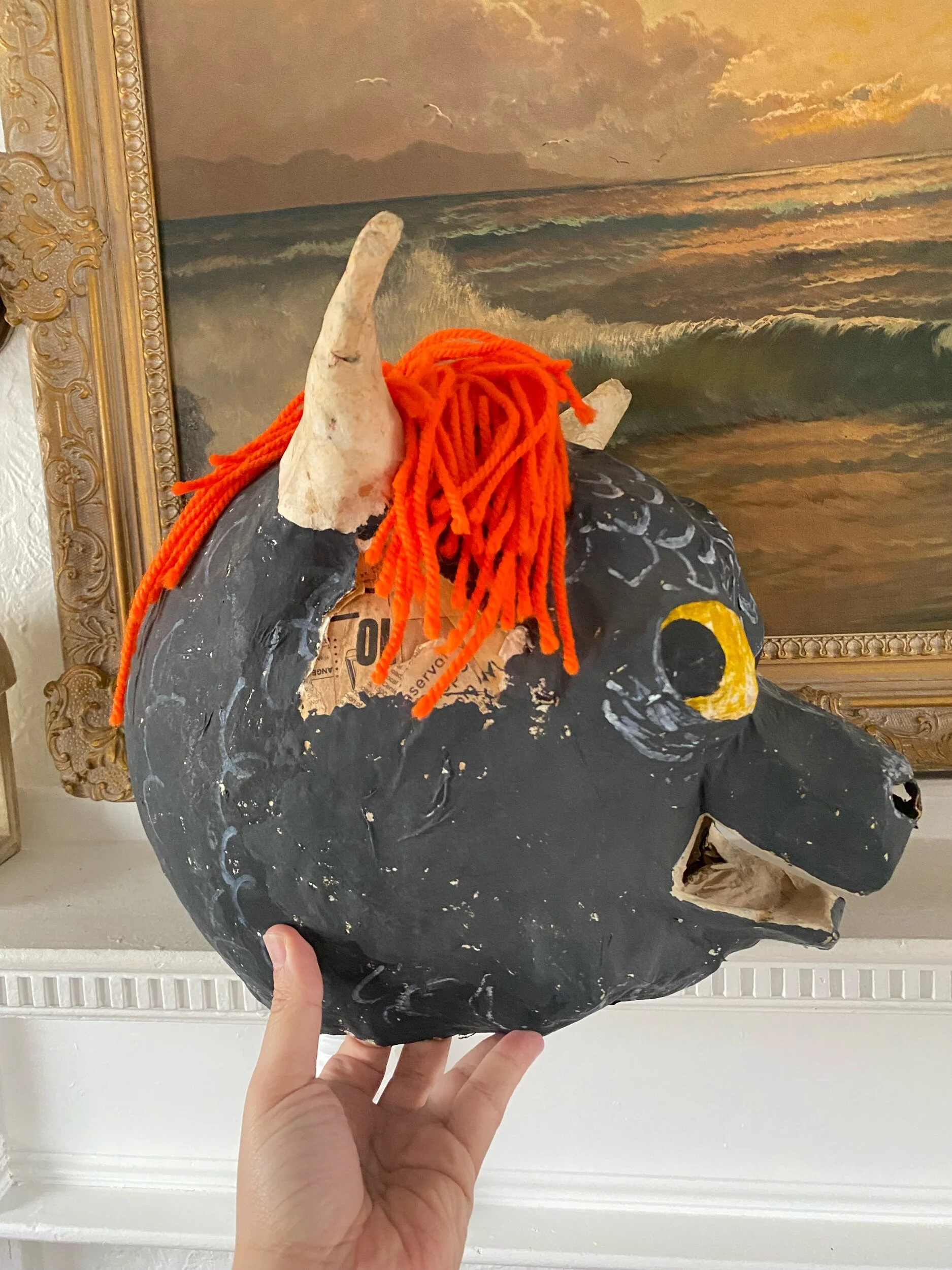 one of my favorite finds this year… a wonderful handmade paper mache mask, possibly once used for a school play? its quite large but most likely made for a child to wear in a school play perhaps. look at how absolutely amazing the cool details on this piece are.