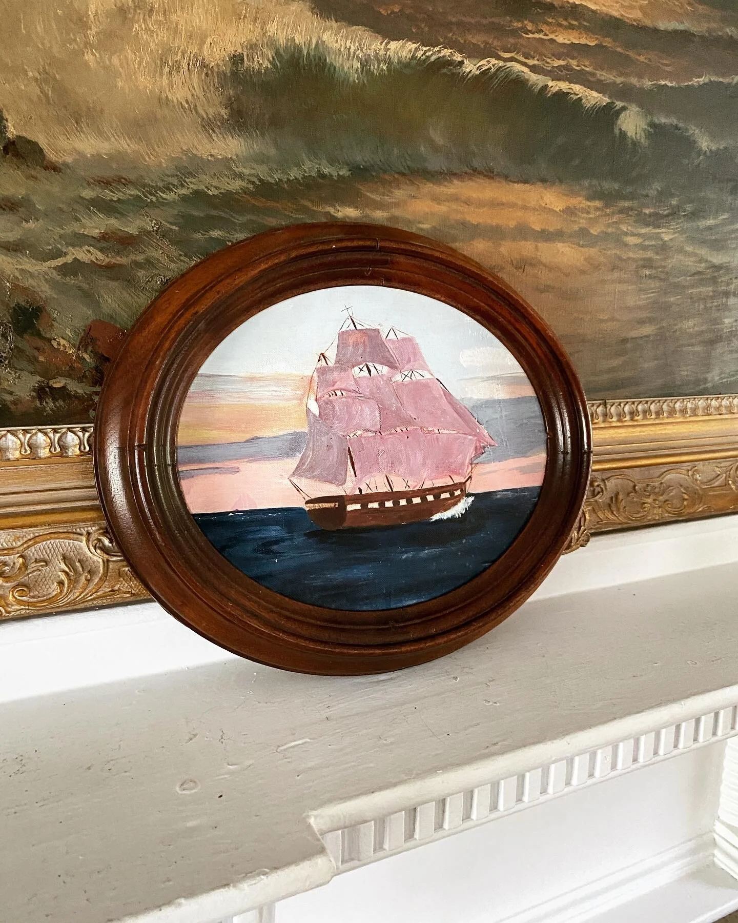 simple vintage ship oil painting on heavy canvas paper with board backing, slightly warped but oh so sweet. in a wonderful wooden oval frame, ready to hang.